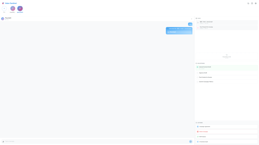 Valen Sentinel is a secure, unified workspace that replaces the chaos of scattered communication with one encrypted hub for every influencer partnership. Instead of juggling email threads, Instagram DMs, and Google Drive links, you get one platform where everything lives.